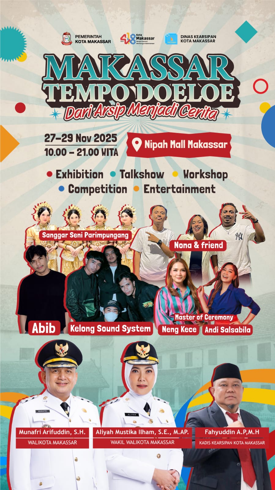 MEDIACREATIVE.ID – MAKASSAR,- Dinas Kearsipan Kota Makassar melaporkan kegiatan SKPD sehubungan kegiatan Pameran Arsip dengan tema “Makassar Tempo Doeloe dari Arsip Menjadi Cerita”. Pameran akan diselenggarakan mulai besok 27-29 Nopember 2025 di Mall Nipah lantai II yang akan dibuka langsung oleh Wakil Wali Kota Makassar, Aliyah Mustika Ilham mewakili Wali Kota Makassar.