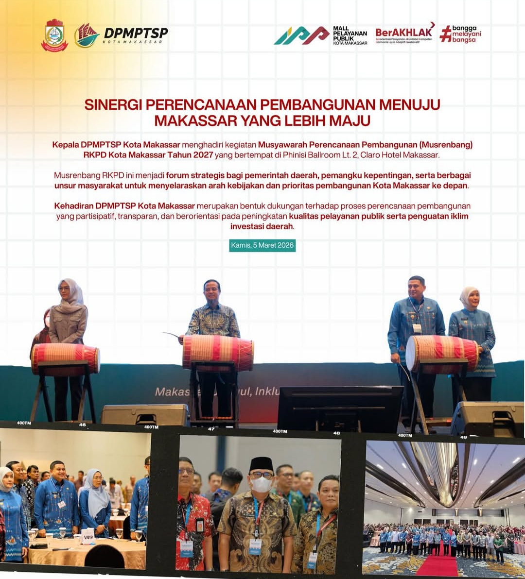 Kehadiran DPMPTSP Kota Makassar merupakan bentuk dukungan terhadap proses perencanaan pembangunan yang partisipatif, transparan, dan berorientasi pada peningkatan kualitas pelayanan publik serta penguatan iklim investasi daerah.